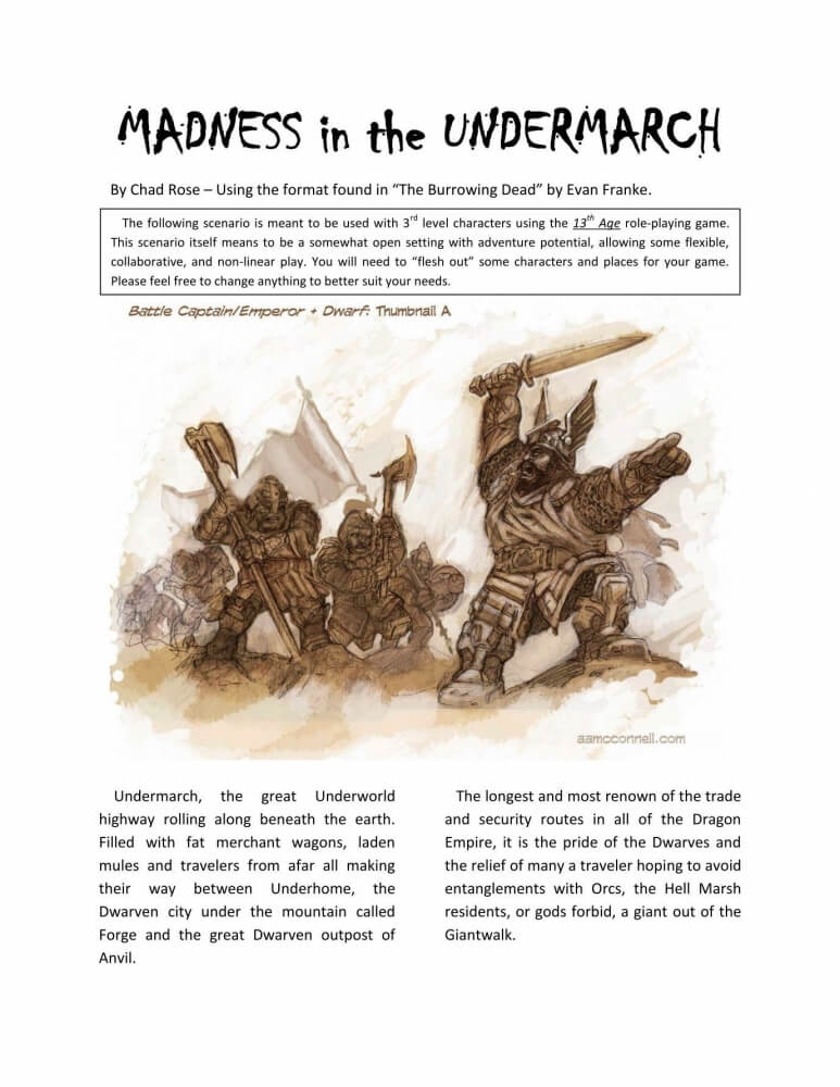Recentemente, mercadores e caravanas que viajavam por Undermarch foram emboscados. Os mercadores morreram e seus bens foram roubados. Os oficiais submarinos, nomeados pelos militares do Rei Anão, não conseguiram localizar esta nova ameaça. O Rei Anão decidiu buscar a ajuda de grupos de aventureiros e mercenários para sufocar esta nova ameaça, não querendo alocar recursos de outras partes do império Anão que são necessários para se defender da invasão dos Orcs, os habitantes de Hell Marsh, e as ameaças do Giantwalk acima do Undermarch ou do envenenado Drow que reside nas profundezas do Submundo. Para personagens de 3º nível. Sistema 13th Age Dependência de Idioma Não jogável em outra língua Domínios RPG Mecânicas Narração de Histórias, Papel e Caneta, Rolagem de Dados, RPG Categorias Campanha, Expansão ou Suplemento Temas Fantasia
