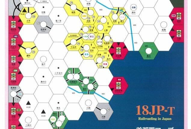 18JP-T é um jogo 18xx japonês ambientado na área da Grande Tóquio. As regras para 18JP-T são idênticas às de 1830 , com as seguintes alterações: • O mapa mostra a área da Grande Tóquio. • Os hexágonos são numerados de Ta76 a Tl198. • A cidade de Tóquio consiste em 7 hexadecimais marcados com T, as atualizações custam ¥ 80 de amarelo para verde e novamente de verde para marrom. • Existem tiles “T” especiais para Tóquio em verde, marrom e cinza (J01 a J13). • Existem 6 privates (A a F). • São 11 empresas (cinza, amarelo, roxo, verde escuro, azul claro, vermelho, rosa, marrom, verde claro, laranja, azul escuro). • 7 empresas começam em um dos 7 hexágonos de Tóquio, apenas 4 empresas começam fora de Tóquio. • Cada empresa tem um ou dois poderes especiais. • A maioria das empresas tem como destino uma área vermelha que proporciona o dobro da receita. • Não há tiles com curvas acentuadas, nem para tiles simples, tiles de estação pequenos ou tiles de estação grande. • Tiles amarelos com uma ou duas estações pequenas nunca podem ser atualizados. Dependência de Idioma Pouco texto, facilmente memorizavel. Domínios Jogos Expert Mecânicas Colocação de Peças, Construção de Rotas, Especulação Financeira, Leilão, Mercado de Ações Categorias Imprima e Jogue Temas Economia / Produção, Transportes