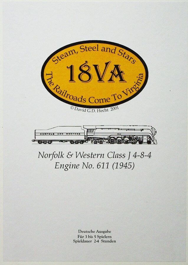 18VA é um jogo 18xx ambientado na Virgínia, bem como em áreas vizinhas pertinentes de Maryland e do Distrito de Columbia. 18VA é um jogo pequeno, no estilo dos jogos de um estado 18GA e 18AL de Mark Derrick, e foi criado como uma mudança em relação aos jogos 18xx mais robustos frequentemente jogados. O principal gancho neste jogo são os trens de carvão, que operam principalmente do Oeste-Leste, levando carvão das montanhas para a costa, enquanto os trens de passageiros percorrem as rotas Norte-Sul. Interessante também é o fato de todas as ferrovias operarem apenas com a cota do presidente vendida, e abrir com 5 cotas e expandir para 10 a critério do proprietário. Dependência de Idioma Pouco texto, facilmente memorizavel. Domínios Jogos Expert Mecânicas Colocação de Peças, Construção de Rotas, Especulação Financeira, Leilão, Mercado de Ações Categorias Temas Economia / Produção, Transportes