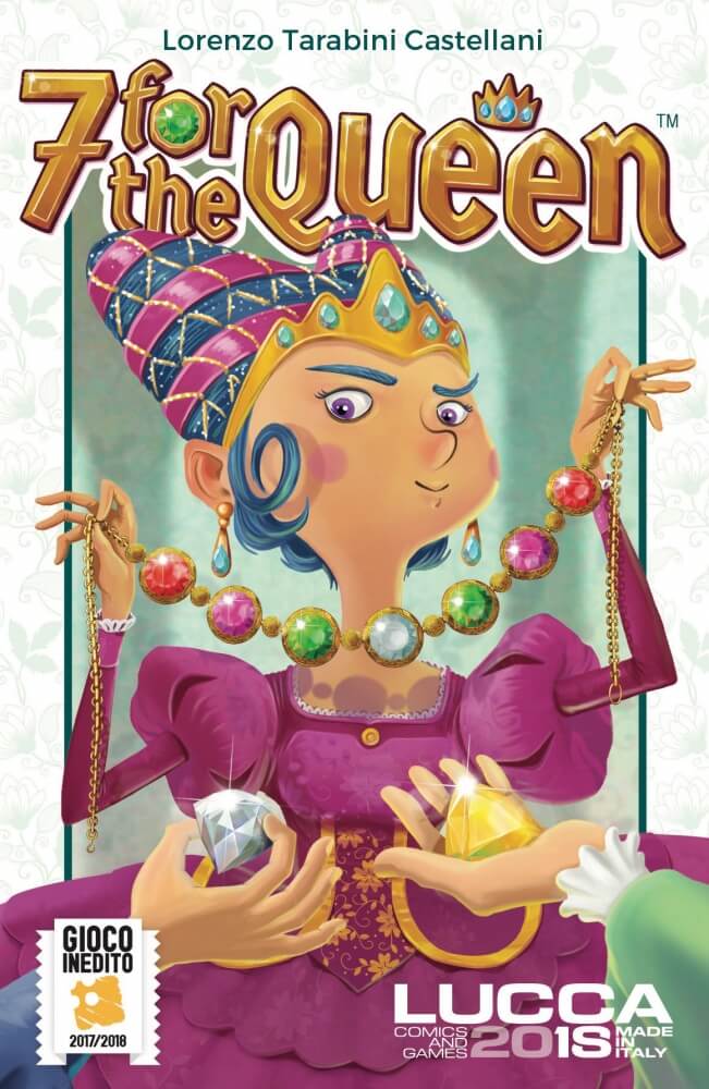 Em 7 for the Queen, os jogadores competem para criar um novo colar para a Rainha, mas não é fácil atender às suas necessidades e desejos em constante mudança, e eles têm que garantir que eles tenham a combinação certa quando a Rainha finalmente decidir o que ela quer. 7 for the Queen venceu o concurso anual de “Melhor Jogo Não-publicado” patrocinado por dV Giochi e Lucca Comics and Games, e esta edição limitada do jogo é parte da recompensa. Dependência de Idioma Nenhuma Domínios Jogos Família Mecânicas Colecionar Componentes, Gestão de Mão Categorias Jogo Festivo Temas