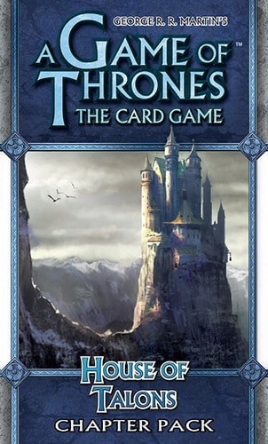 House of Talons é o quinto pacote de 60 cartas fixas para o ciclo “Wardens” de A Game of Thrones: The Card Game. Ele contém três cópias de cada uma das vinte diferentes cartas nunca antes vistas, destinadas a aumentar os baralhos existentes e adicionar variedade para o jogo base. O foco são nos esquemas dos senhores e senhoras pacientes, indiferentes à disputa do Trono ou muito distantes. Dependência de Idioma Extenso. Precisa de uma tradução quase completa para ser jogado. Domínios Jogos Expert Mecânicas Ação Simultânea, Gestão de Mão, Jogadores com Diferentes Habilidades, Seleção de Cartas, Negociação Categorias Colecionável, Expansão ou Suplemento, Jogo de Cartas Temas Luta / Artes Marciais, Medieval, Fantasia, Literatura, Cultura Pop ou Geek