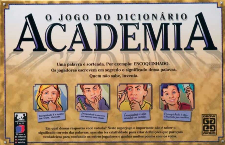 Academia é um jogo que desenvolve a criatividade, um exercício para os jogadores demonstrarem a habilidade de blefar para convencer seus adversários de que sua resposta é a correta! O importante não é saber o significado correto das palavras, mas sim ter criatividade para confundir os outros jogadores e ganhar muitos pontos. Reimplementação do jogo Leréia. Editora Nacional Grow Jogos e Brinquedos Status Nacional Lançado Dependência de Idioma Não jogável em outra língua Domínios Jogos Família Mecânicas Papel e Caneta, Votação, Ação Simultânea, Apostas, Dedução Categorias Temas Humor