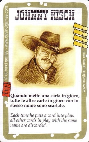 Johnny Kisch é uma carta de expansão para BANG!. Cada vez que ele coloca uma carta em jogo, todas as outras cartas em jogo com o mesmo nome são descartadas. Johnny Kisch está incluído na versão “Bang! The Bullet!” Dependência de Idioma Pouco texto, facilmente memorizavel. Domínios Jogos Família Mecânicas Gestão de Mão, Eliminação de Jogadores, Jogadores com Diferentes Habilidades, Jogo em Equipe, Blefe, Dedução Categorias Expansão ou Suplemento, Jogo de Cartas Temas Faroeste, Humor, Luta / Artes Marciais