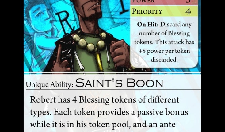 Robert luta acumulando marcadores de fichas ao longo do tempo. Cada token lhe dá uma poderosa habilidade passiva e pode ser gasto para garantir uma habilidade de uso único mais forte. Robert é um dos personagens principais do “Sinner e Saint Remix” de Iron Clown Studios, um quadrinho de estilo Manga. Esta promo está disponível nas cabines de convenções de Level 99 Games, Iron Clown Studios Convention Booths e na loja online Level 99 Games. Dependência de Idioma Extenso. Precisa de uma tradução quase completa para ser jogado. Domínios Jogos Expert Mecânicas Ação Simultânea, Gestão de Mão, Jogadores com Diferentes Habilidades Categorias Expansão ou Suplemento Temas