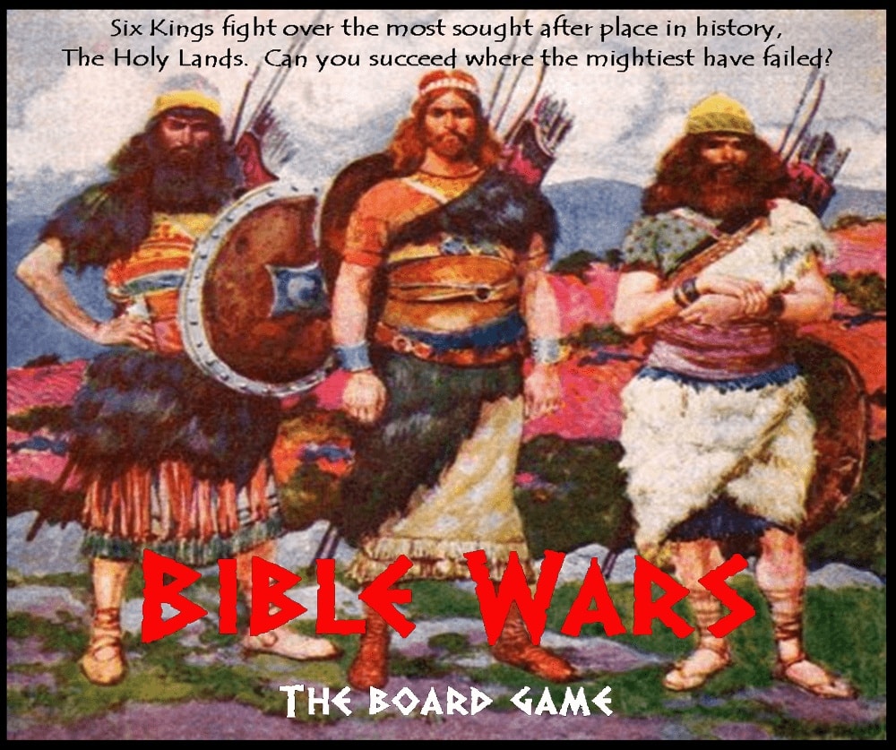 Bible Wars: the board game, eleva o nível tático do Jogo de Cartas Bible Wars ao próximo nível. O jogo apresenta as mesmas 6 culturas em um mapa estratégico das terras sagradas. No jogo, cada cultura está tentando capturar e manter 18 territórios para vencer, mas não é fácil. O primeiro jogador a cada turno é determinado aleatoriamente. O combate é determinado, não apenas por quem tem mais exércitos, mas pelo terreno e pelo jogo de cartas culturais do exército. As cartas dão a cada lado uma vantagem a ser acrescentada à rolagem de dados. O combate pode continuar várias rodadas até que o atacante recue ou o defensor seja eliminado. Não há retirada para o zagueiro. As vantagens culturais incluem carros egípcios, gigantes filisteus, elefantes de guerra da Babilônia, intervenções celestiais israelenses, forças locais adicionais cananeus e unidades profissionais assírias. Dependência de Idioma Moderado, precisa de uma planilha traduzida ou cartas traduzidas. Domínios Jogos Expert Mecânicas Campanha/ Batalhas Dirigidas por Cartas, Construção de Baralho/Peças, Gestão de Mão, Jogadores com Diferentes Habilidades, Seleção de Cartas Categorias Campanha, Jogo de Cartas Temas Religião