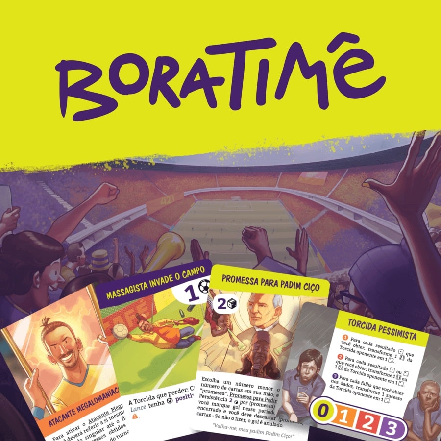 Boratimê é um jogo de cartas sobre torcidas de futebol que se rivalizam enquanto a pelota é disputada em campo. O objetivo é inspirar raça na sua equipe do coração ao mesmo tempo em que faz da torcida adversária motivo de chacota e atrapalha os jogadores com estratégias diversas, tais como tocar instrumentos irritantes, entoar hinos zombeteiros ou até mesmo requisitar intervenção divina no campo. Cada jogador é uma Torcida inteira reagindo aos Lances do jogo. A torcida que reage melhor empurra seu time para o gol. Ao fim da partida, a torcida que tiver inspirado o maior número de gols sai vitoriosa. – Use cartas de ação para sua torcida fazer mais bonito (ou o adversário fazer mais feio!) – Ative reações especiais da sua torcida para criar combos e estratégias próprias – Invoque os craques em campo para criar o elemento surpresa – Dispute partidas sempre diferentes com mais de 100 cartas únicas. Editora Nacional Independente Status Nacional Em Desenvolvimento Dependência de Idioma Moderado, precisa de uma planilha traduzida ou cartas traduzidas. Domínios Jogos Expert Mecânicas Gestão de Mão, Jogadores com Diferentes Habilidades, Rolagem de Dados, Seleção de Cartas, Toma essa, Vazas/Truques Categorias Jogo de Cartas, Jogo de Dados Temas Humor, Esportes