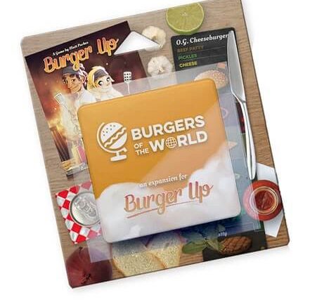 Burgers of the World expande Burger Up com 6 novas receitas e 24 novos ingredientes de 5 diferentes países: Austrália, França, Alemanha, Japão e México. Dependência de Idioma Pouco texto, facilmente memorizavel. Domínios Jogos Família Mecânicas Construção a partir de Modelo, Gestão de Mão Categorias Expansão ou Suplemento, Jogo de Cartas, Quebra-Cabeça Temas