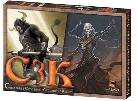 C3K, que significa “Creatures Crossover Cyclades / Kemet”, é uma mini-expansão que contém sete cartas para Cyclades e seis tiles para Kemet. Estes componentes permitem que você use as criaturas do Cyclades (e as Cyclades: expansão Hades) em Kemet e as criaturas da Kemet em Cyclades. Com esta expansão adicionado à Kemet, as lendas gregas se jutam à luta, trazendo novos poderes para o seu exército. Agora você pode fazer o Kraken aparecer no rio Nilo e se beneficiar de sua força, use o olhar mortal da Medusa para destruir escudos inimigos e muito mais. Com esta expansão adicionada a Cyclades, você pode contratar reforços egípcios, um novo tipo de tropa que vem com um ataque especial. Use The Mummy para levantar inimigos mortos em tropas sob o seu controle, use o elefante para melhorar suas jogadas de dados, e muito mais. Dependência de Idioma Nenhuma Domínios Jogos Expert Mecânicas Controle/Influência de Área, Movimento de Área, Seleção de Cartas Categorias Expansão ou Suplemento, Miniaturas Temas Luta / Artes Marciais, História, Mitologia, Civilização