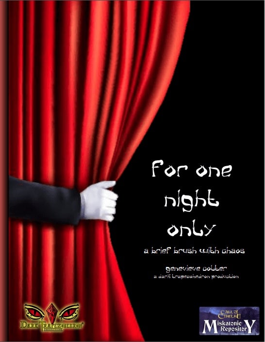 Uma Fantasmagoria de Ilusão e Decepção … Senhoras e senhores, sentem-se e testemunhem o show daquele e único Thoth, o Magnífico! Um banquete de feitos impossíveis espera por você, um espetáculo que poucos viram e viveram para contar a história. E essa revelação no final? Será realmente uma noite que você não esquecerá tão cedo… For One Night Only é um interlúdio curto para aterrorizar os investigadores e se conectar a outros cenários. É apresentado como parte de The Miskatonic Files, um conjunto de cenas curtas e utilitários das produções Dark Trapezohedron para Keepers que precisam de um pouco de brilho extra para seus jogos. Sistema Basic Role-Playing (BRP) Dependência de Idioma Não jogável em outra língua Domínios RPG Mecânicas Narração de Histórias, Papel e Caneta, Rolagem de Dados, RPG Categorias Campanha, Expansão ou Suplemento Temas Horror