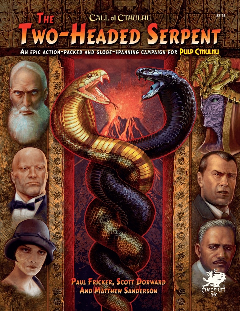 A Serpente de Duas Cabeças é uma campanha cheia de ação, de abrangência mundial e alta octanagem, definida nos anos 30 para a Pulp Cthulhu. Os heróis enfrentam as conspirações sinistras de uma antiga raça de monstros, empenhada em recuperar um mundo que já foi deles. Trabalhando para a Caduceus, uma organização de assistência médica, os heróis saquearão um templo perdido nas florestas da Bolívia, enfrentarão a máfia na cidade de Nova York, enfrentarão uma epidemia mortal nas selvas do norte de Bornéu, descobrirão o funcionamento de um estranho culto no Oklahoma da era do pó, infiltre-se no território inimigo dentro de um vulcão que está despertando na Islândia, enfrente os horrores de horríveis experimentos médicos no Congo, corra para controlar um artefato antigo e poderoso nas ruas de Calcutá e, finalmente, viaje a um continente perdido por uma batalha desesperada para salvar a humanidade da escravidão ou aniquilação! Embalado com nove aventuras cheias de adrenalina, conselhos para o Keeper, lindos mapas coloridos e apostilas de jogadores. Sistema Basic Role-Playing (BRP) Dependência de Idioma Não jogável em outra língua Domínios RPG Mecânicas Narração de Histórias, Papel e Caneta, Rolagem de Dados, RPG Categorias Campanha, Expansão ou Suplemento Temas Aventura, Horror
