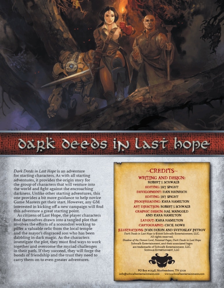 Os designers e artistas que criaram as artes do Shadow of the Demon Lord: Maldades em Última Esperança (2016) são Robert J. Schwalb em conjunto com Ivan Dixon, Kara Hamilton.