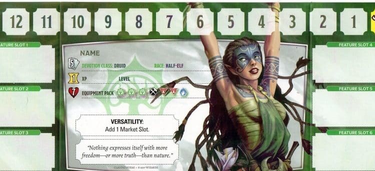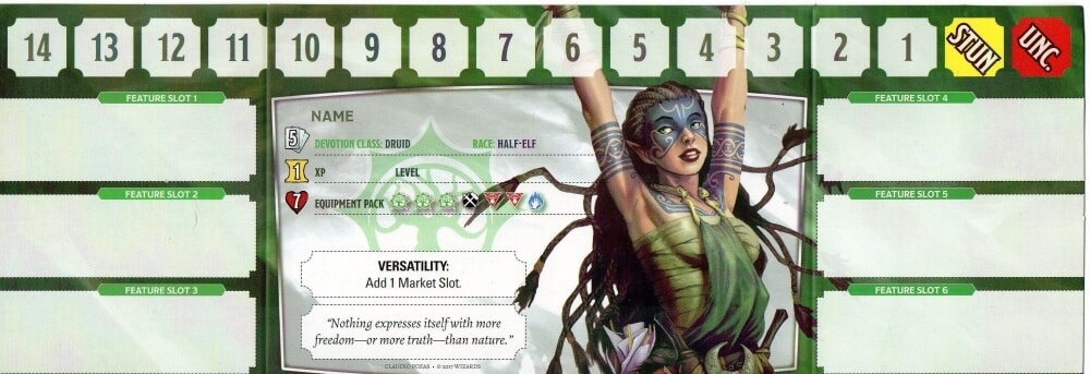 Meia Elf Druid Demo/Promo de compra da Gen Con 2017, frente e verso. É de duas classes, permitindo mais uma carta vermelha para uma carta verde a menos no equipamento inicial. Dual-classing está disponível para outros personagens através de habilidades in-play. Dependência de Idioma Extenso. Precisa de uma tradução quase completa para ser jogado. Domínios Jogos Expert Mecânicas Construção de Baralho/Peças, Cooperativo, Gestão de Mão, Jogadores com Diferentes Habilidades, Seleção de Cartas Categorias Expansão ou Suplemento, Jogo de Cartas Temas Fantasia