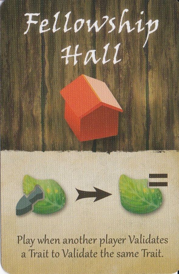 Parte do Tantrum House Season 7 Kickstarter, contém 2 cartas do mesmo tipo: Fellowship Hall Você pode ativar esta ferramenta quando outro jogador valida uma Característica para validar a mesma Característica Dependência de Idioma Moderado, precisa de uma planilha traduzida ou cartas traduzidas. Domínios Jogos Família Mecânicas Alocação de Trabalhadores, Colecionar Componentes, Controle/Influência de Área, Rolagem de Dados Categorias Expansão ou Suplemento Temas Ciências, Educacional