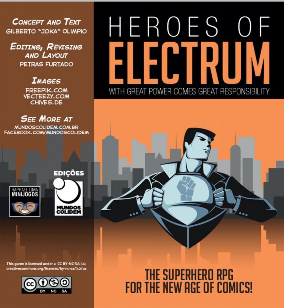 Heróis de Electrum é um jogo de super-heróis com a proposta de simular a atual fase das HQs, a chamada Era de Electrum (também conhecida como Nova Era de Platina) e dos filmes e séries modernos de super-heróis, como Vingadores, Defensores, Liga da Justiça e Jovens Titãs. Neste jogo, você é um herói que arrisca sua vida para salvar o mundo (ou seu bairro), proteger os fracos, combater o crime e as forças opressoras, afinal… Editora Nacional Mundos Colidem Status Nacional Lançado (Outubro/2019) Sistema Lima System Dependência de Idioma Não jogável em outra língua Domínios RPG Mecânicas Narração de Histórias, Papel e Caneta, Rolagem de Dados, RPG Categorias Temas Aventura, Quadrinhos