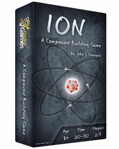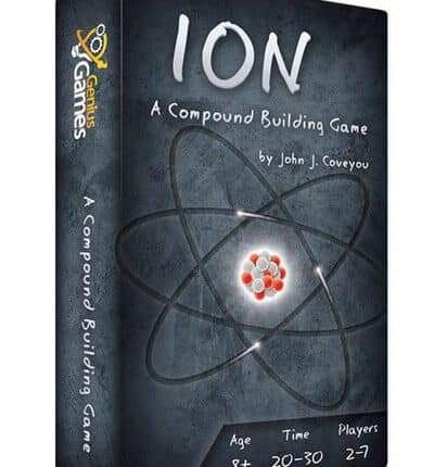Ion: A Compound Building Game é um jogo de seleção de cartas onde o jogador deve escolher entre uma série de cartas disponíveis (cartas de Ion e cartas de gases nobres) com o objetivo de criar conjuntos de compostos e gases nobres inertes. Cada jogador recebe oito cartas, deve selecionar uma dessas cartas e, em seguida, passa o restante. Os jogadores devem optar por ligar a sua carta selecionada com outro elemento da carta ou defini-lo sozinho (possivelmente para formar uma ligação iônica em um momento posterior). Durante todo o jogo, os jogadores ganham pontos adicionais para a construção de compostos específicos que são listados nas cartas de objetivo e tem disponível um conjunto de Telhas de Ação que lhes concedem movimentos adicionais ao longo do jogo. Os jogadores marcam pontos com base na quantidade e tipo de compostos equilibrados que eles constroem e conjuntos de gases nobres que eles coletam. Depois de três rodadas, os jogadores adicionam seus pontos totais de cada rodada, subtraem pontos das Telhas de Ação usadas, e o jogador com mais pontos ganha! Dependência de Idioma Pouco texto, facilmente memorizavel. Domínios Jogos Família Mecânicas Colecionar Componentes, Construção a partir de Modelo, Cooperativo, Seleção de Cartas, Dedução Categorias Jogo de Cartas, Jogo Festivo Temas Educacional, Ciências