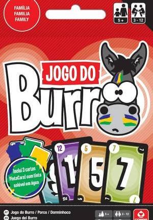 No Jogo do Burro, é preciso ter atenção em todos os jogadores para não ser o último a baixar as cartas. Contém 58 cartas, incluindo 3 cartas ‘PintaCara!’ com tinta solúvel em água. O objetivo do jogo é ficar sem cartas na mão o mais rápido possível. Cada vez que um jogador perde, é assinalada uma letra da palavra “burro”. O jogador que completar primeiro a palavra, é o burro e será o perdedor do jogo, conta-se o número de cartas que esse jogador ainda tem, e é costume tirar-se uma carta chamada ano de perdão e o resultado são os anos de burro do jogador perdedor. O vencedor é o último que não tenha completado a palavra enquanto os outros tenham. – Cada jogador recebe três cartas; – O jogador à esquerda do distribuidor começa jogando na mesa a carta mais alta que tiver na mão, de qualquer naipe, por exemplo, um 8 de copas; o segundo jogador tem de jogar outra carta de copas no monte (é obrigado a assistir). Se tiver uma carta de copas, o jogo prossegue com o próximo jogador da mesma forma, se não, ele compra do bolo (baralho) até obter uma carta desse naipe; – Ganha o direito a iniciar a próxima rodada o jogador que colocar a carta mais alta na mesa. Editora Nacional Copag Dependência de Idioma Nenhuma Domínios Jogos Família Mecânicas Gestão de Mão Categorias Jogo de Cartas, Jogo Festivo Temas