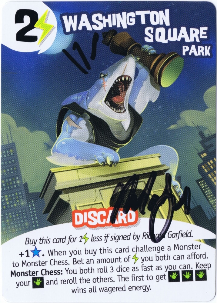 Carta promocional emitida pela primeira vez em Essen 2014. Descarte: Compre este cartão por menos 1 de energia se for assinado por Richard Garfield. + 1 ponto de fama. Quando você compra esta carta, desafie um Monster para o Monster Chess. Aposte uma quantidade de energia que ambos podem pagar. MONSTER CHESS: Vocês dois rolam 3 dados o mais rápido que puderem, mantenha suas garras e re role as outras, o primeiro a receber três garras ganha toda a energia apostada. Esta promo é feita para ser assinada e entregue pelo próprio Richard Garfield.” Dependência de Idioma Moderado, precisa de uma planilha traduzida ou cartas traduzidas. Domínios Jogos Família Mecânicas Rolagem de Dados, Seleção de Cartas Categorias Expansão ou Suplemento, Jogo de Cartas, Jogo de Dados Temas