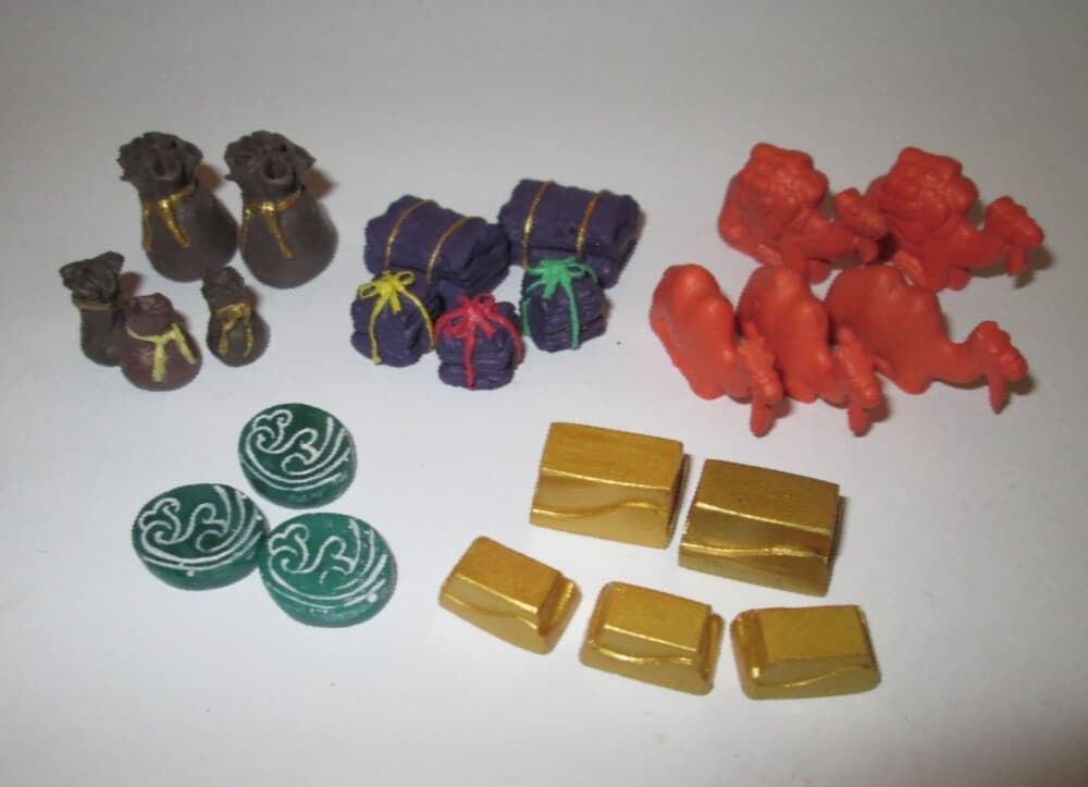 Quantidades: 26 Pedras de Jade 18 Barras de Ouro (14 pequenos e 4 Grandes) 18 Rolos de Seda (14 pequenos e 4 Grandes) 19 Sacos de Especiarias (14 pequenos e 5 Grandes) 26 Camelos (20 pequenos e 6 Grandes) Total 107 peças. Sleeves Sem informações.