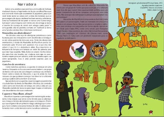 Mausoléu do mago Macellum está de volta! E junto com ele, enormes tesouros dispostos para aventureiros que estiverem dispostos a se arriscar. Será que vão ter coragem de encarar uma lenda “viva”? Em uma cripta extremamente mortal, nem tudo é o que parece. Essa aventura está disponível para o sistema Cripta RPG e para Dungeon Crawl Classic e dura cerca de 2 a 4 horas. Pode ser mestrada em um one shot ou colocada modularmente numa campanha! Editora Nacional Cripta RPG Status Nacional Lançado (Fevereiro/2020) Sistema Cripta RPG, Dungeon Crawl Classics Dependência de Idioma Não jogável em outra língua Domínios RPG Mecânicas Narração de Histórias, Papel e Caneta, Rolagem de Dados, RPG Categorias Campanha, Expansão ou Suplemento Temas Fantasia, Horror
