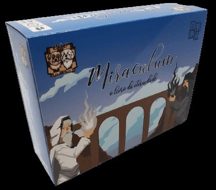 A milhares de anos Miraculum o livro da eternidade foi colocado em uma ponte com quatro guardiões sagrados da magia branca e da magia negra para defender o equilíbrio entre as forças do bem e do mal. A magia que emana do livro despertou uma ambição em seus guardiões que agora lutam até a morte para alcançá-lo e ser o detentor do poder do livro. Escolha seu lado e ajude os guardiões a tomar posse do Miraculum O Livro da Eternidade. Miraculum é um jogo rápido baseado no lance de dados para ser jogado em duplas (2vs2) ou em modo de duelo um contra um (1vs1) onde você deverá escolher entre defender a magia branca ou a magia negra. Você e seus oponentes irão lutar até a morte para ser o novo detentor do livro sagrado o “Miraculum”. Em cada turno você terá que combinar o resultado dos seus dados para conseguir conjurar magias de atacar, proteger, andar, empurrar, prender, envenenar, curar, inverter posição ou até mesmo sumonar um lobsomem contra seus inimigos. Objetivo do Jogo: Matar todos os magos da cor oposta lançando eles da ponte, ou conseguir tomar posse do Miraculum o livro da eternidade. Editora Nacional Cãobuleiro Status Nacional Lançado (Outubro/2020) Dependência de Idioma Nenhuma Domínios Jogos Família Mecânicas Eliminação de Jogadores, Jogo em Equipe, Rolagem de Dados, Toma essa, Force sua sorte, Movimento Ponto-a-Ponto, Rolar e Mover Categorias Jogo de Dados, Jogo de Entrada, Jogo Assimétrico Temas Fantasia, Luta / Artes Marciais, Aventura