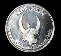 As moedas Munchkin começaram com o primeiro Munchkin Silver Piece em 2008, um item promocional que oferece vários benefícios no jogo. A editora lançou uma peça de prata diferente a cada ano desde então. Normalmente, as moedas só podem ser obtidas como itens promocionais em torneios ou convenções. Às vezes, eles são incluídos nas compras de jogos feitas diretamente pelo editor. Em dezembro de 2009, um número limitado de moedas de Natal Munchkin foi colocado à venda. Estas foram duas moedas de 2010 coloridas em vermelho e verde. O mesmo foi feito um ano depois com as moedas de 2011. Porém, nenhuma moeda foi lançada em dezembro de 2011. As moedas têm regras adicionais acima e além da regra mensal padrão. Em abril de 2010, o Munchkin Blue Silver Piece foi incluído na edição 122 da Game Trade Magazine . A moeda azul também possui uma regra adicional. Dependência de Idioma Pouco texto, facilmente memorizavel. Domínios Jogos Expert Mecânicas Jogadores com Diferentes Habilidades, Rolagem de Dados Categorias Expansão ou Suplemento, Jogo de Cartas Temas Fantasia, Humor