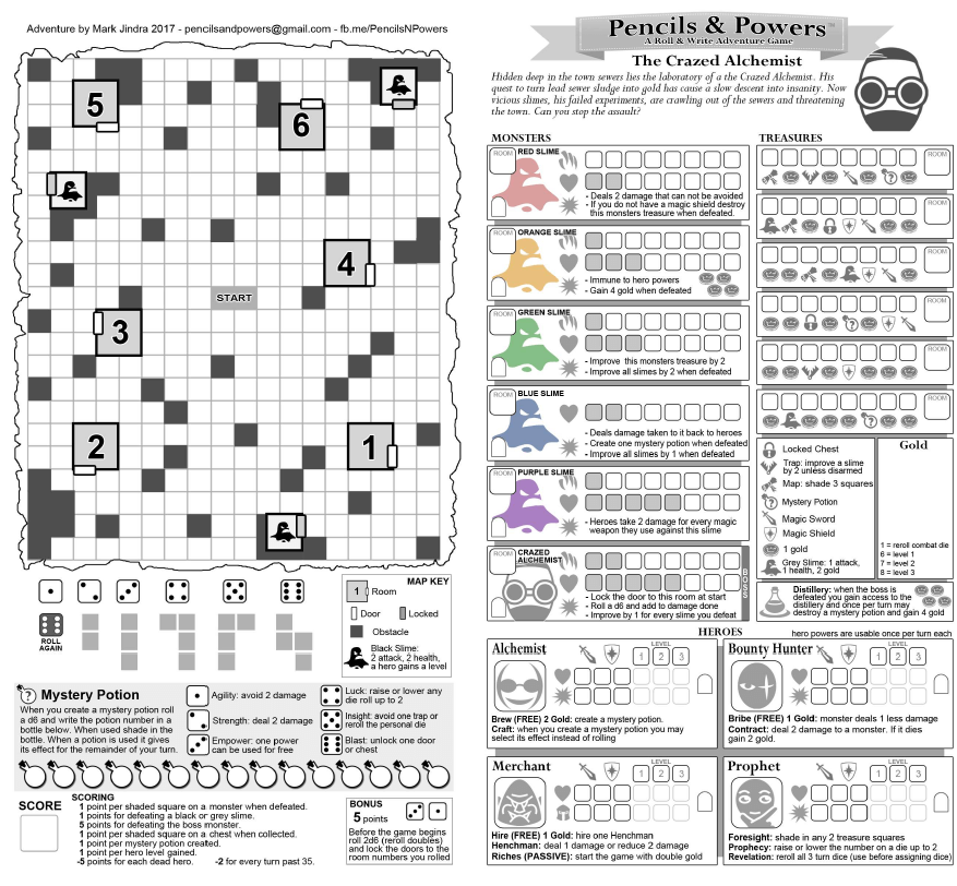 Pencils & Powers é um jogo de aventura Roll & Write. Role 3D6 e use os resultados para derrotar monstros, reunir tesouros e melhorar seus heróis antes que o tempo acabe. Todos os jogadores jogam simultaneamente com o mesmo resultado dos dados. No entanto, cada um escolhe individualmente onde atribuir esses dados. À medida que o jogo avança, os heróis terão acesso a salas cheias de monstros e tesouros. O tesouro fica maior, os heróis ficam mais fortes e os monstros se tornam mais poderosos à medida que o jogo avança. O jogo termina quando o tempo acabar, seus heróis estão todos mortos ou você derrotou todos os monstros. Uma pontuação final é registrada e um vencedor final é declarado. Ao todo existem 12 aventuras disponíveis. Dependência de Idioma Extenso. Precisa de uma tradução quase completa para ser jogado. Domínios Jogos Expert Mecânicas Papel e Caneta, Rolagem de Dados Categorias Imprima e Jogue, Jogo de Dados, Dungeon Crawler Temas Fantasia