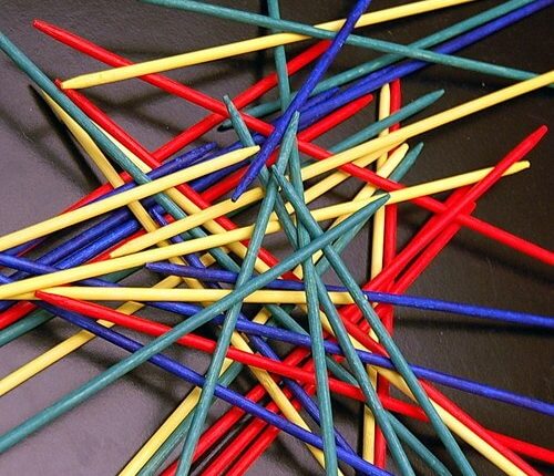 Varetas são espalhadas sobre a mesa em uma mistura. O preto é usado como uma ferramenta para pegar as outras. O jogador pega um palito de cada vez, até que ele mova uma outra vareta além daquela que está tentando pegar. Os pontos são distribuídos com base na cor das varetas recuperadas. Acredita-se que o jogo foi desenvolvido a partir das hastes usadas para adivinhação pelo chinês I Ching. Publicado na Alemanha por volta de 1850. Dependência de Idioma Nenhuma Domínios Jogos Infantis Mecânicas Categorias Temas