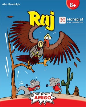 Jogo desenvolvido por Alex Randolph, um pequeno jogo de cartas com muita animação e estratégia. Em RAJ, cada jogador tem à sua disposição um baralho de cartas numeradas de 1 a 15. Estas cartas servem para leiloar pontos que tanto podem ser positivos como negativos. No início de cada turno é mostrada a pontuação pela qual se vai lutar. Os pontos positivos são ganhos pelo jogador que jogar a carta mais alta e os negativos pelo jogador que jogar a mais baixa. Aqui o que conta é perceber quais são as pontuações que ainda faltam sair para se poder fazer uma gestão cuidada das cartas que o jogador terá em mãos. Pode pensar que basta guardar as cartas mais altas para os leilões onde os pontos em disputa são mais elevados para se vencer a partida. De facto o seu raciocínio até está muito bem elaborado, mas a chatice é que sempre que dois ou mais jogadores jogam cartas com o mesmo valor, empatam, e isso origina um pequeno problema. Os jogadores envolvidos nos empates anulam suas pontuações em cima da mesa e a carta é pega pelo jogador cuja carta jogada tem o valor seguinte ao do empate. O mesmo se aplica quando está na mesa um valor negativo. E como percebeu, empates é o que não faltarão. RAJ é portanto um jogo de estratégia, onde interessa saber quais são as cartas que saíram, as que faltam sair e convém pensar naquilo que os outros ainda têm ainda na mão. Ao mesmo tempo é um jogo cheio de divertimento onde qualquer criança a partir dos 8 anos consegue jogar com os adultos. Dependência de Idioma Nenhuma Domínios Jogos Família Mecânicas Ação Simultânea, Blefe Categorias Jogo de Cartas Temas Animais