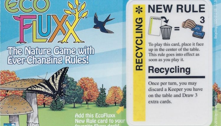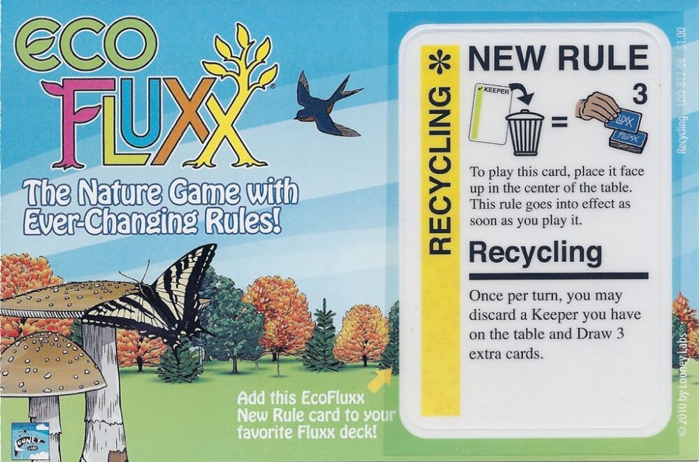 Esta é uma nova regra que você pode adicionar a qualquer deck Fluxx. Ele diz: “Uma vez por turno, você pode descartar um Keeper que você tem na mesa e comprar 3 cartões extras”. Este cartão foi publicado em 2010 para promover o lançamento da segunda edição do EcoFluxx. É um cartão que é destacado de um cartão postal. Dependência de Idioma Extenso. Precisa de uma tradução quase completa para ser jogado. Domínios Jogos Família Mecânicas Gestão de Mão Categorias Expansão ou Suplemento, Jogo de Cartas Temas Meio Ambiente