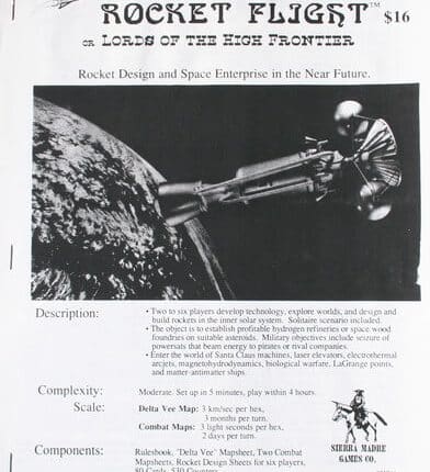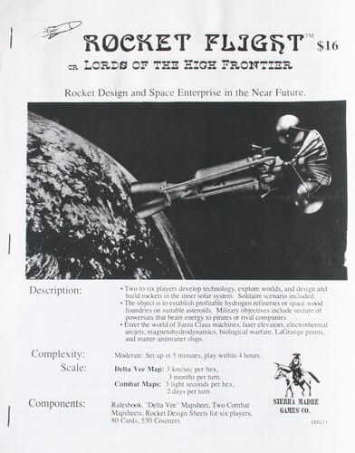 Cada jogador começa como uma empresa espacial no ano de 2020 tentando fazer um lucro no desenvolvimento do comércio e da tecnologia. O design utiliza as teorias de pontos de Lagrange, impulso específico, e fontes de energia remotas. A partir de 2003, este jogo ficou fora de catálogo. A partir de 2010, completamente redesenhado como High Frontier. Dependência de Idioma Extenso. Precisa de uma tradução quase completa para ser jogado. Domínios Jogos Expert Mecânicas Marcadores e Hexágonos Categorias Temas Ficção Científica, Economia / Produção, Transportes