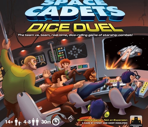 Space Cadets: Dice Duel – o “Time vs Time, em tempo real, Jogo de Rolagem de Dados de Combate Espacial!” – coloca duas naves espaciais umas contra as outras em combate rápido. Os jogadores são divididos em duas equipes, cada equipe jogando com a tripulação de uma nave e ganhando ou perdendo juntos. O jogo termina quando um lado destrói seu oponente, fazendo quatro pontos de dano por meio de torpedos ou minas. Cada nave tem seis pontes de comando: – Engenharia gera energia para as outras estações. – manobras do leme da nave no mapa. – Armas carrega os tubos de torpedos para atacar o inimigo. – Sensores travam o inimigo para torpedos baterem, e usa jammers para parar o inimigo de bloquear. – Escudos ajudam a proteger a nave de torpedos inimigos. – Tração pega cristais poderosos, move a nave inimiga no mapa, e lança Minas. Cada jogador está a cargo de uma ou mais destas estações, ou tem o papel global do comandante para coordenar tudo. O jogo continua com os jogadores atuando tão rapidamente quanto possível até que um lado ganha. Dependência de Idioma Nenhuma Domínios Jogos Expert Mecânicas Ação / Movimento Programado, Ação Simultânea, Jogo em Equipe, Rolagem de Dados, Tempo real Categorias Jogo de Dados Temas Ficção Científica