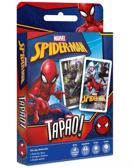 Lembrando que o jogo de tabuleiro Spider-Man Marvel: Tapão é um jogo pensado para pessoas com idade a partir de 5 anos e é indicado para 2 a 4 jogadores, além de ter sessões de jogo que duram em média 15 minutos.