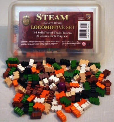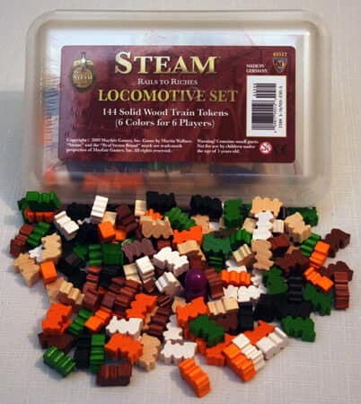 Trens para o jogo Steam. 144 trens de madeira que substituem os discos com figuras de madeira de trem em 6 cores dos jogadores, também marcador do jogador inicial. Dependência de Idioma Nenhuma Domínios Jogos Expert Mecânicas Colocação de Peças, Construção de Rotas Categorias Expansão ou Suplemento Temas