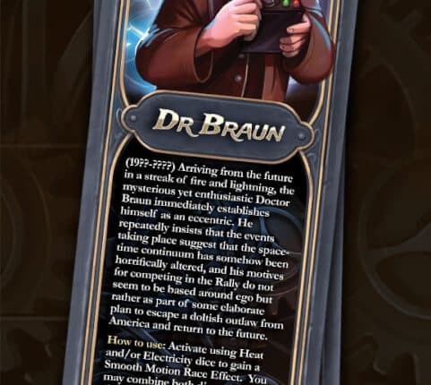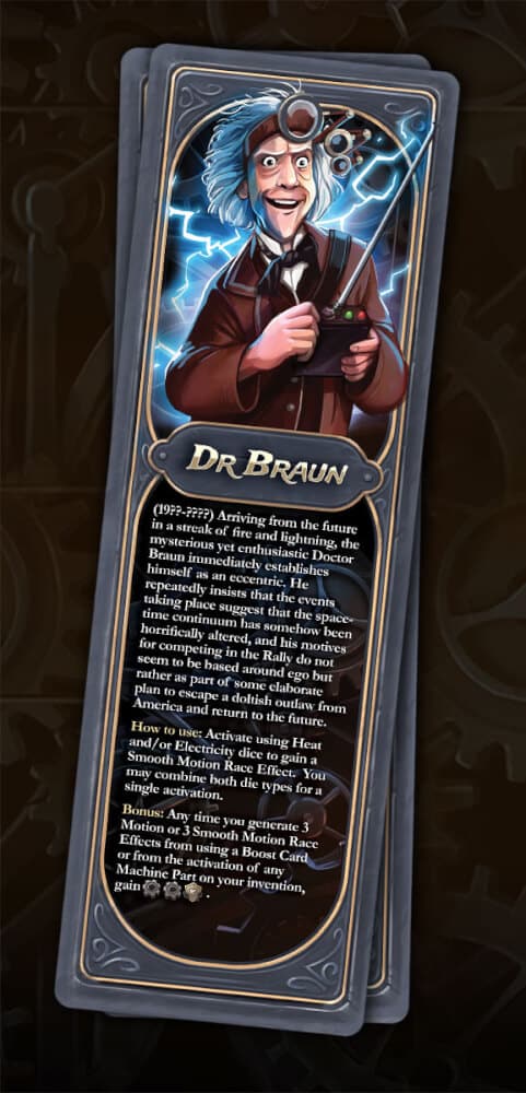 Dr. Braun é um personagem promocional para Steampunk Rally, disponibilizado inicialmente como uma opção print-and-play, no entanto, está disponível para compra e pode ser inclusa numa futura expansão. Em vez de utilizar duas cartas (um cockpit e uma máquina), Dr. Braun é uma única carta 2×1 retratando o carro de “De Volta Para o Futuro”. Pode ser ativado por um dado de fogo ou elétrico e uma múltipla ativação fornece um movimento suave para cada 4 pips colocadas, com um máximo de 3 movimentos! Há também um bônus extra para cada vez que uma parte da sua máquina é ativada e gera três movimentos suaves ou normais por uma única ativação e você ganha 2 engrenagens e 1 escudo. Dependência de Idioma Extenso. Precisa de uma tradução quase completa para ser jogado. Domínios Jogos Família Mecânicas Alocação de Trabalhadores, Seleção de Cartas Categorias Expansão ou Suplemento, Imprima e Jogue, Jogo de Dados Temas Esportes