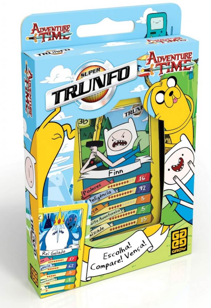 Versão do famoso jogo Super Trunfo com personagens do desenho animado Hora de Aventura. Escolha uma característica; compare as cartas de todos os jogadores; e quem tiver o maior valor leva todas as cartas em disputa. Ganha quem conseguir todas as cartas. Editora Nacional Grow Jogos e Brinquedos Dependência de Idioma Pouco texto, facilmente memorizavel. Domínios Jogos Família Mecânicas Gestão de Mão, Apostas Categorias Jogo de Cartas Temas
