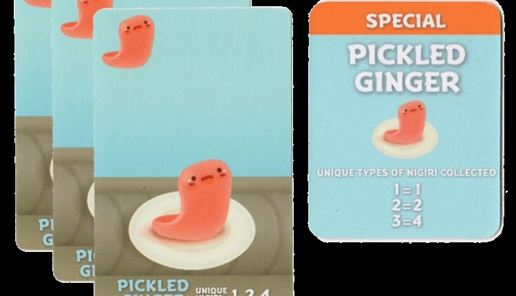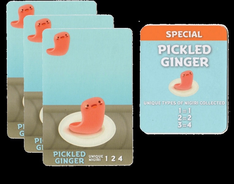 Gengibre em conserva é um nigiri único e conta para a coleta de outros nigiri únicos. Esta promoção tem três cartas mais uma peça de regras. Dependência de Idioma Moderado, precisa de uma planilha traduzida ou cartas traduzidas. Domínios Jogos Família Mecânicas Colecionar Componentes, Gestão de Mão, Seleção de Cartas Categorias Expansão ou Suplemento, Jogo de Cartas, Jogo Festivo Temas Gastronomia