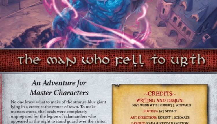 Ninguém sabia o que fazer com aquele gigante azul estranho em uma cratera no meio da cidade. E para piorar, os habitantes locais estavam completamente despreparados para a legião de salamandras que apareceram durante a noite para montar guarda em volta do visitante. Todos os esforços feitos para estudar o gigante firam forçadamente repelidos pelos sisudos guardiões, que faziam sons ameaçadores em seu idioma sibilante. Temendo a violência, os habitantes se afastaram, mas agora, a tensão está à flor da pele e as pessoas cochicham acerca dos objetivos da criatura, porque ele ainda permanece imóvel e quem são e de onde vieram exatamente seus protetores. Enquanto os rumores espalham o pânico pela comunidade, uma heroína chega à cidade, uma Cavaleira da Deus Verdadeiro que deixou bem clara suas intenções. O visitante misterioso deve morrer. O Homem Que Caiu em Urth é uma aventura para personagens de nível Mestre que chegaram em um clima de tensão e devem descobrir o que realmente está acontecendo. Editora Nacional Pensamento Coletivo Status Nacional Lançado (Outubro/2018) Sistema Demon Lord Engine Dependência de Idioma Não jogável em outra língua Domínios RPG Mecânicas Jogadores com Diferentes Habilidades, Narração de Histórias, Papel e Caneta, Rolagem de Dados, RPG Categorias Expansão ou Suplemento Temas Literatura