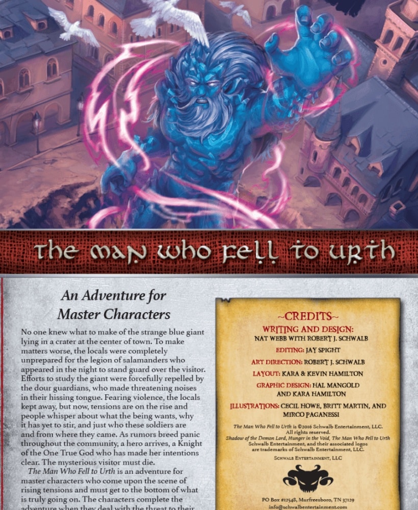 Os designers e artistas que criaram as artes do Shadow of the Demon Lord: O Homem que Caiu em Urth (2016) são Robert J. Schwalb, Nathan Webb em conjunto com Kara Hamilton, Cecil Howe.