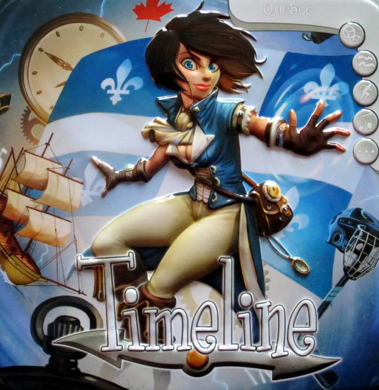 Jogo composto de 110 cartas que representam um determinado evento histórico. Contudo, a respectiva data histórica é representada em apenas um dos lados. Os jogadores tentam colocar suas cartas em ordem cronológica e, ao revelarem a data, retiram as cartas que foram alocadas erroneamente e permanecem com as corretas. O primeiro jogador que conseguir colocar todas suas cartas na sequência correta ganha. O jogo é focado na cultura e história de Quebec, Canadá. Dependência de Idioma Pouco texto, facilmente memorizavel. Domínios Jogos Família Mecânicas Colocação de Peças Categorias Jogo de Cartas, Trivia Temas Educacional