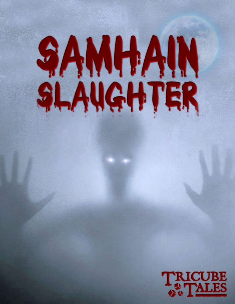 “Um culto misterioso tem aterrorizado a cidade por meses, mas na véspera do Halloween, eles irão lançar sua maldição mais audaciosa – conjurar uma entidade sobrenatural sob a luz pálida da lua azul e enviá-la em uma violência sangrenta pela cidade! A única coisa que está contra esse plano nefasto é uma gangue de corajosos alunos do ensino médio com habilidades paranormais. Monstros sempre caminharam entre nós, mas a maioria dos humanos felizmente não tem consciência da verdade, e geralmente é melhor para todos se eles permanecerem assim. Mas alguém precisa estar disposto a revidar. Você nasceu com um dom especial, que aprendeu a manter em segredo dos “normais”. Agora é hora de usar seus poderes para proteger a cidade e ensinar uma lição àqueles sectários vis! ” Projetado como um especial de Halloween, Samhain Slaughter é um cenário independente para o sistema Tricube Tales e pode ser usado como um micro-cenário, mas também é um RPG de uma página totalmente independente. Você pode imprimi-lo em uma única folha de papel: a primeira página inclui tudo que você precisa para jogar, enquanto uma segunda página opcional expande o gerador de aventura com exemplos e reviravoltas. Sistema Tricube Tales Dependência de Idioma Não jogável em outra língua Domínios RPG Mecânicas Narração de Histórias, Papel e Caneta, Rolagem de Dados, RPG Categorias Campanha Temas Horror