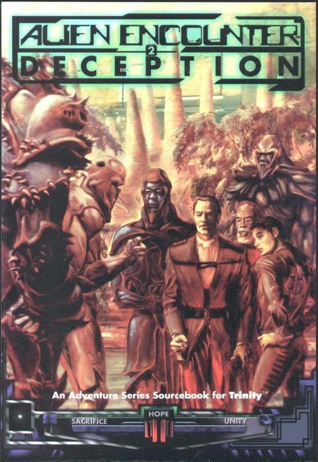 Nós viemos em paz Apesar de anos de interação com a raça Qin, suas intenções para com a humanidade permanecem um mistério. Da mesma forma, apenas com contato recente, os verdadeiros motivos da Coalizão alienígena também são postos em dúvida. Chegou a hora da humanidade descobrir a verdade por trás do interesse de cada raça alienígena na Terra. Mas os alienígenas? Deception é o capítulo final da série de aventuras Alien Encounter em duas partes que explora as enigmáticas – e muitas vezes perigosas – raças alienígenas do Universo Trinity, enquanto os personagens investigam o estranho Qin e a malévola Coalizão. O material fonte abrangente também fornece aos Narradores muitas informações sobre os alienígenas, que podem ser usadas em muitos cenários diferentes. Sistema Storyteller Dependência de Idioma Não jogável em outra língua Domínios RPG Mecânicas Narração de Histórias, Papel e Caneta, Rolagem de Dados, RPG Categorias Expansão ou Suplemento Temas Ficção Científica
