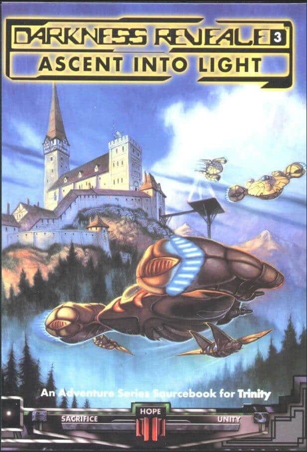 Com fé e convicção A contenda divide as ordens psi quando elas devem se unir contra uma terrível ameaça além das estrelas. O tempo é curto e as apostas são maiores do que nunca. Você deve unificar a humanidade e encontrar o segredo para derrotar esta energia antes que ela destrua a Terra! A verdade é exposta Ascent into Light é a terceira e última parcela da série de aventuras Darkness Revealed para o cenário de ficção científica Trinity. Este livro conclui a história épica de Descent into dark e Passage Through Shadow, uma saga que muda o Universo da Trindade para sempre. Sistema Storyteller Dependência de Idioma Não jogável em outra língua Domínios RPG Mecânicas Narração de Histórias, Papel e Caneta, Rolagem de Dados, RPG Categorias Expansão ou Suplemento Temas Ficção Científica