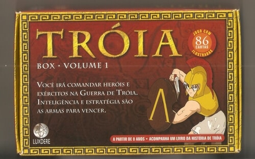 Troia é um de jogo de cartas brasileiro para 2 jogadores sobre a Guerra de Tróia. Cada jogador tem um baralho de cartas e duela contra o adversário no campo de batalha em cima da mesa. As cartas são Exércitos (cavalaria, infantaria e catapultas), Heróis, Deuses, armamentos e cartas especiais. As cartas têm um número de “força” de combate. O jogador coloca sobre a mesa três cartas de exércitos (ou heróis) em 3 colunas e o adversário coloca suas 3 cartas também, cara a cara com as cartas dos inimigos. Após isso, é possível reforçar a sua força de combate, colocando as cartas de armamento em qualquer coluna de combate. O jogador com mais força de combate nas colunas, vence a rodada nessa coluna e ganha pontos igual à diferença entre o seu ponto de combate e o ponto de combate adversário. Ganha o jogo quem conseguir obter 1500 pontos primeiro. É preciso papel e caneta para anotar os pontos ganhos. Pesquisa do jogo foi feita por Paôla Manfredini Romão. Editora Nacional Luxdere Editora Educacional Dependência de Idioma Nenhuma Domínios Jogos Expert Mecânicas Gestão de Mão, Seleção de Cartas Categorias Jogo de Cartas, Jogo de Guerra Temas Guerra, Medieval, Mitologia, Ciências