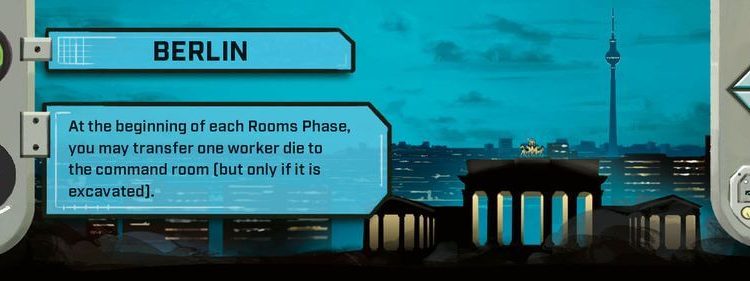 Tile de cidade adicional lançado na revista spielbox, edição # 1 2021 (edição em inglês). Berlim (F / D) Lado azul (pesquisa 5) “No início de cada Fase de Salas, você pode transferir um dado de trabalhador para a sala de comando (mas apenas se for escavado).” Lado vermelho (pesquisa 4) “No início de cada Fase de Salas, você pode transferir um dado de trabalhador para qualquer espaço escavado na coluna do meio.” Dependência de Idioma Moderado, precisa de uma planilha traduzida ou cartas traduzidas. Domínios Jogos Expert Mecânicas Apostas, Movimento em Grades, Rolagem de Dados Categorias Expansão ou Suplemento Temas Ficção Científica