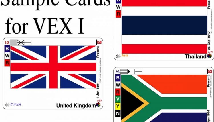 VEX é um jogo de cartas colecionável que vem em cinco conjuntos diferentes: I – Nações do Mundo II – Estados e Províncias III – Entidades Históricas IV – Cantões e Prefeituras V – Entidades Internacionais No total, são 1000 cartas diferentes, cada uma mostrando uma bandeira diferente e as diferentes características dessa bandeira. Há uma variedade de jogos incluídos em cada conjunto, usando as estatísticas e características das bandeiras como base. Dependência de Idioma Nenhuma Domínios Jogos Expert Mecânicas Colecionar Componentes Categorias Colecionável, Estratégia Abstrata, Jogo de Cartas Temas Ciências