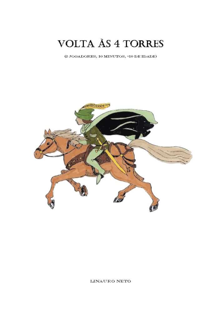 Volta às 4 Torres* é uma corrida de cavalos. Sim, daquelas pomposas corridas que eram disputadas por nobres cavaleiros e amazonas em épocas de festividades diante de poderosos reis, rainhas e castelos e que almejavam apenas e humildemente o favor da(o) mais bela(o) princesa(príncipe). Nesses tempos, a famosa Volta às 4 Torres era a mais conhecida e prestigiada corrida de cavalos, num reino bem distante do nosso. Nela, os(as) corajosos(as) cavaleiros e amazonas disputavam em duplas a vitória e deveriam ser rápidos(as) o suficiente para contornarem primeiro as famosas 4 Torres da Antiga Fortaleza. Mas não se enganem, no percurso, eles(as) tinham que saltar habilmente sobre as barreiras e esquivar dos obstáculos colocados na pista, para só então sagrarem-se os(as) campeões(ãs), obtendo a glória, o favor da(o) princesa(príncipe) e entrarem, finalmente, para as páginas dos livros das histórias das corridas de cavalo. No jogo, cada pessoa controla 1 time com 2 cavaleiros ou amazonas, representados(as) por 2 cavalos da mesma cor. O objetivo é vencer a corrida, cruzando a linha de chegada com os seus 2 cavalos antes do(a) oponente. * Volta às 4 Torres é um protótipo e foi desenvolvido, especialmente, para a participação no Concurso de Design ID#2021, promovido pela Sociedade dos Boards. ** O jogo classificou-se como 7º colocado no Concurso de Design ID#2021, promovido pela Sociedade dos Boards. Editora Nacional Independente Status Nacional Em Desenvolvimento Dependência de Idioma Nenhuma Domínios Jogos Família Mecânicas Movimento em Grades, Movimento Ponto-a-Ponto, Ordem de Fases Variável, Sistema de Pontos de Ação Categorias Imprima e Jogue, Jogo de Entrada Temas Esportes, Fantasia