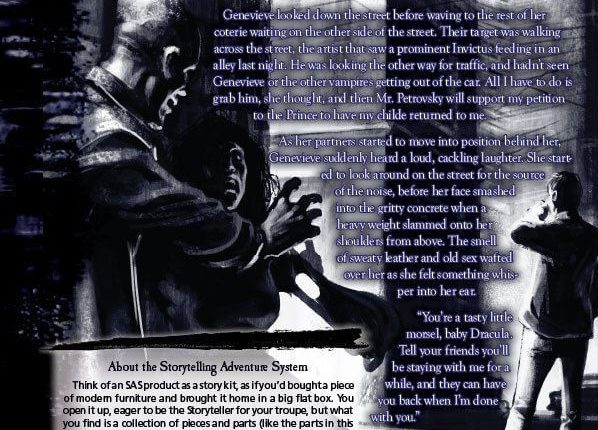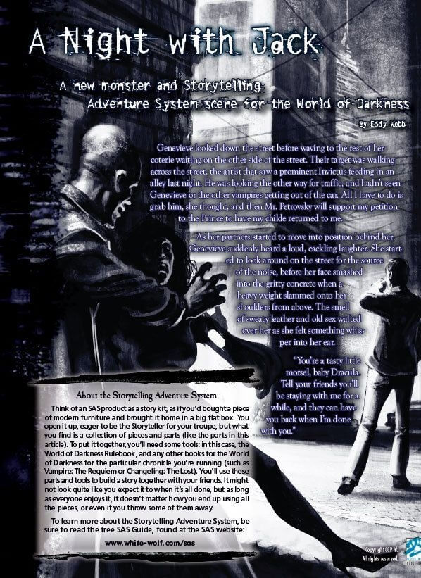 A Night with Jack é um SAS gratuito de uma cena escrito pelo desenvolvedor Eddy Webb para a centésima edição da Game Trade Magazine. Um novo monstro, Spring-Heeled Jack, está pronto para ser usado em sua crônica do Mundo das Trevas, completo com ficha de personagem, elementos de cena e um cartão de cena para adicionar à sua biblioteca de referência do SAS. Sistema Storytelling Dependência de Idioma Não jogável em outra língua Domínios RPG Mecânicas Narração de Histórias, Papel e Caneta, Rolagem de Dados, RPG Categorias Campanha, Expansão ou Suplemento Temas Horror