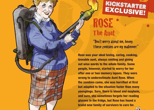 “Não se preocupe comigo, querida. Esses zumbis são o meu tônico.” Rose era aquela perfeita tia amável, carinhosa, cuidadosa e boa cozinheira, sempre sorrindo e distribuindo sábios conselhos para toda a família. Algumas pessoas, no entanto, começaram a se preocupar com ela depois de um ou dois lapsos de memória. Eles estavam errados em subestimar a Tia Rose. Quando os zumbis chegaram ela ficou horrorizada inicialmente, mas se adaptou à situação mais rapidamente que muitos jovens. Claro, há sangue e carnificina, e claro, algumas vezes ela esquece seus óculos de leitura na geladeira, mas Rose encontrou uma nova família de sobreviventes para cuidar. Dependência de Idioma Pouco texto, facilmente memorizavel. Domínios Jogos Expert Mecânicas Gestão de Mão, Cooperativo, Jogadores com Diferentes Habilidades, Rolagem de Dados, Sistema de Pontos de Ação, Tabuleiro Modular Categorias Expansão ou Suplemento, Miniaturas Temas Horror