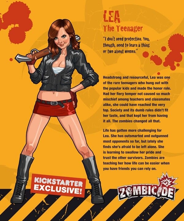 Lea é uma sobrevivente promocional opcional disponível para aqueles que participaram da campanha do Zombicide Season Two no Kickstarter. Uma versão zumbi (Zombivor) também será inclusa. Dependência de Idioma Pouco texto, facilmente memorizavel. Domínios Jogos Expert Mecânicas Gestão de Mão, Cooperativo, Jogadores com Diferentes Habilidades, Rolagem de Dados, Sistema de Pontos de Ação, Tabuleiro Modular Categorias Expansão ou Suplemento, Miniaturas Temas Horror